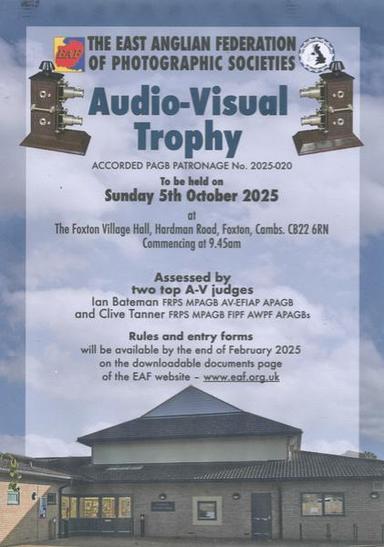 The East Anglian Federation of Photographic Societies (EAF) Audio-Visual Trophy Championship is taking place on Sunday 5th October 2025 at Foxton Village Hall...