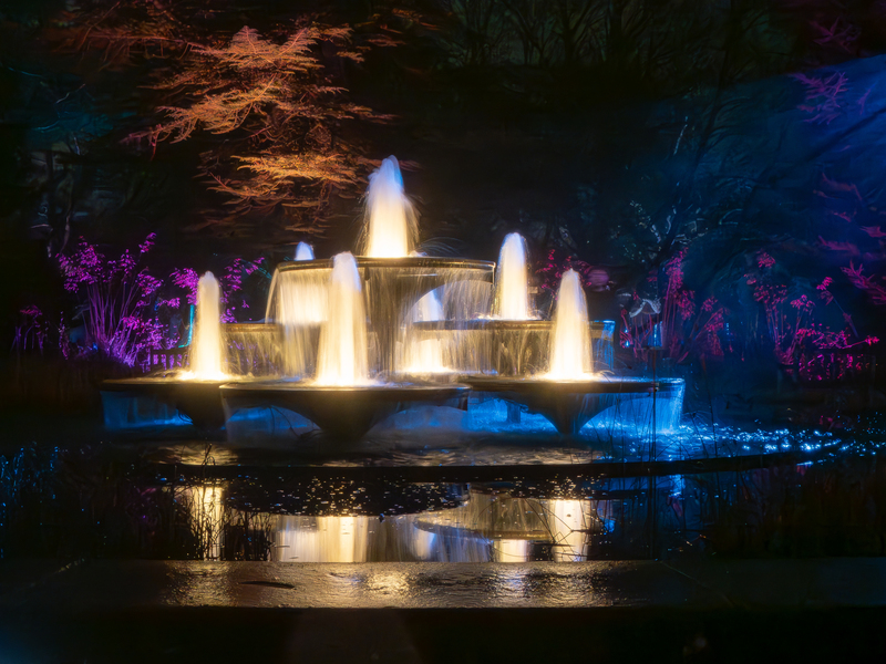 The Cambridge Botanic Garden fountains at night