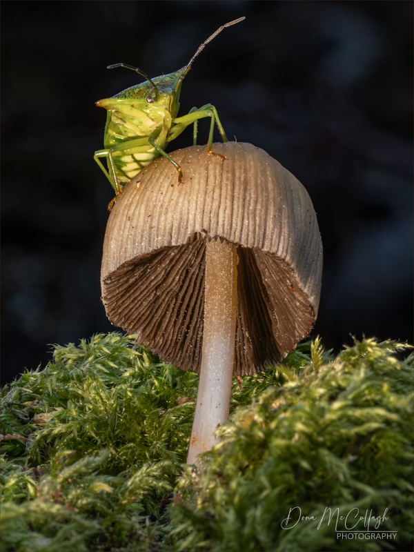 Hawthorn Shield Bug summits Glistening Inkcap in Epping Forest